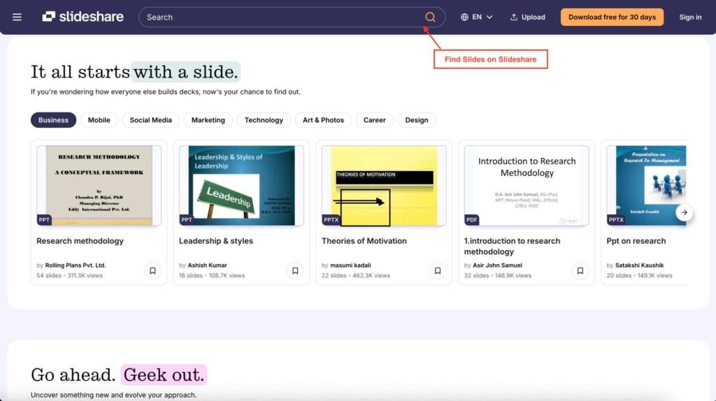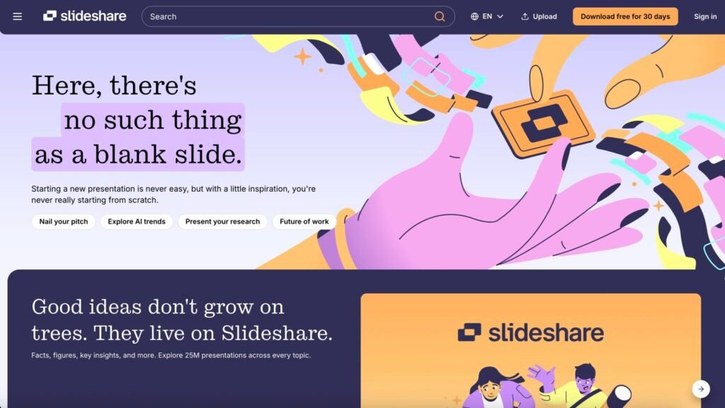 Slideshare has content on just about anything. It features school presentations, work reports, and how-tos. It’s where tons of folks swap knowledge visually. You can find slides about tech, ads, teaching, health, science, and much more, which makes it great for students, teachers, workers, and anyone who wants to learn something.